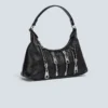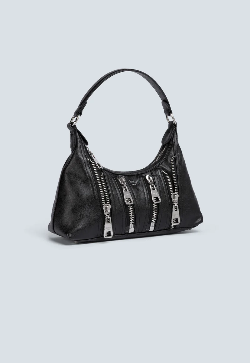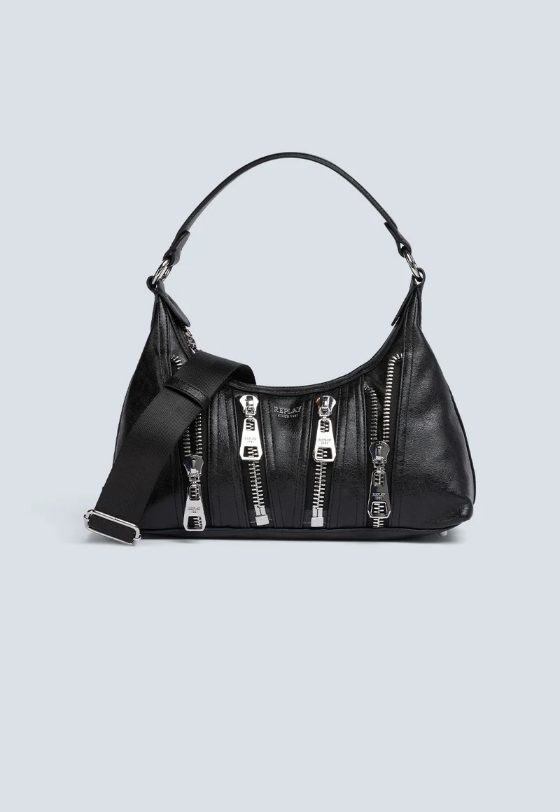 תיק כתף מעוצב לנשים בצבע שחור, עשוי מחומר דמוי עור איכותי בגימור מבריק. כולל מספר רוכסנים דקורטיביים בחזית המעניקים מראה אורבני ונועז, ורצועת כתף רחבה לנוחות מירבית. מושלם להשלמת לוק יומיומי או ערב עם טאץ' אופנתי ואדג’י.