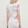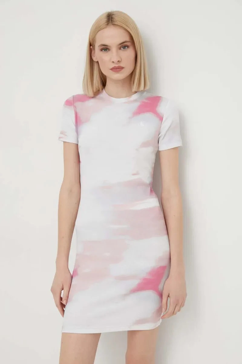 שמלת Calvin Klein צמודה מבד ג׳רסי עם מתיחה, במרקם ריב עדין ובלוגו מודפס לכל אורך הבד.