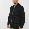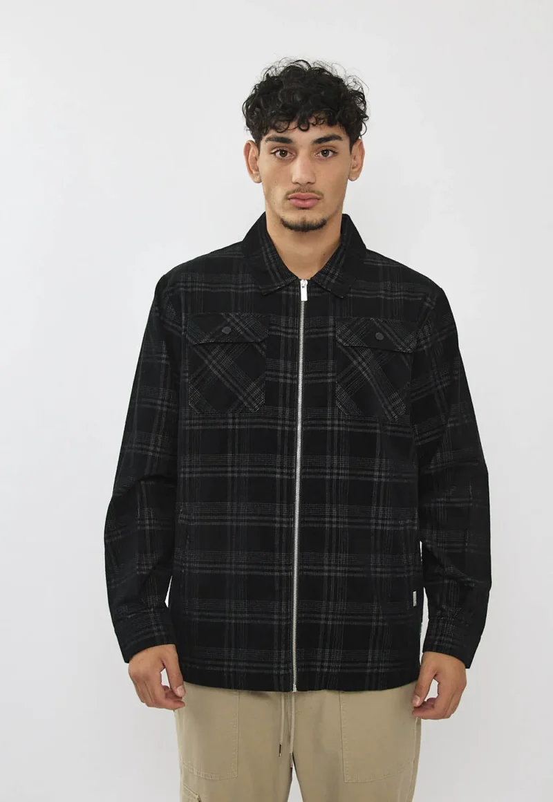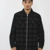 ג'קט קורדורוי לגברים בצבע שחור המשלב מראה מחוספס ומעודכן. עשוי מבד קורדורוי דק ונעים, עם הדפס משבצות עדין שמוסיף עומק וטקסטורה. הג'קט כולל רוכסן מלא בחזית, שתי כיסי חזה עם כפתורים ותפרים מעוצבים למראה אוברסייז קליל ומדויק.