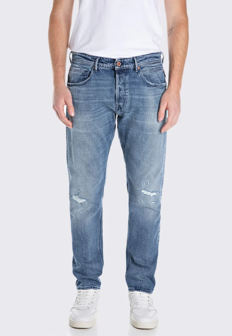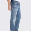 פרטים נוספים : מכנסי ג'ינס בגזרת סקיני מחמיאה לגברים, בצבע כחול עם שטיפה מודגשת וקרעים מעוצבים. כוללים כיסים קדמיים ואחוריים, סגירת רוכסן וכפתור, ועשויים מבד ג'ינס נעים וגמיש לנוחות מקסימלית. מושלמים ללוק אורבני וספורטיבי עם טאץ' אופנתי.
