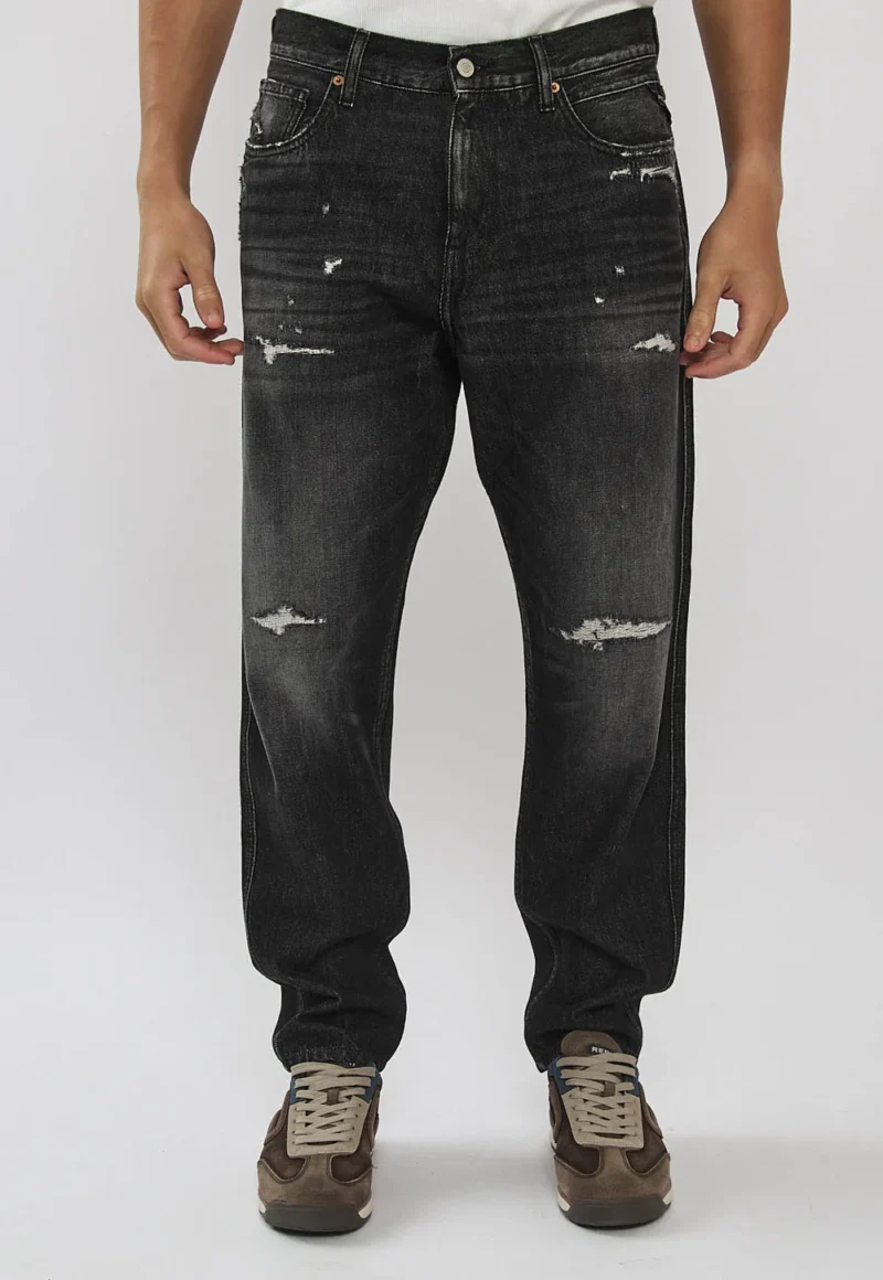 ג׳ינס לגברים בגזרה ישרה־רפויה עם מותן רגילה, בצבע שחור דהוי ושטיפות לייעוד וינטג׳. כולל קרעים ושפשופים עדינים בחזית למראה אורבני מחוספס. עשוי כותנה עם מעט אלסטיין לנוחות וגמישות לאורך היום. חמישה כיסים, סגירת רוכסן וכפתור. מושלם לשילוב עם טי-שירט וסניקרס ללוק יומיומי מעודכן.