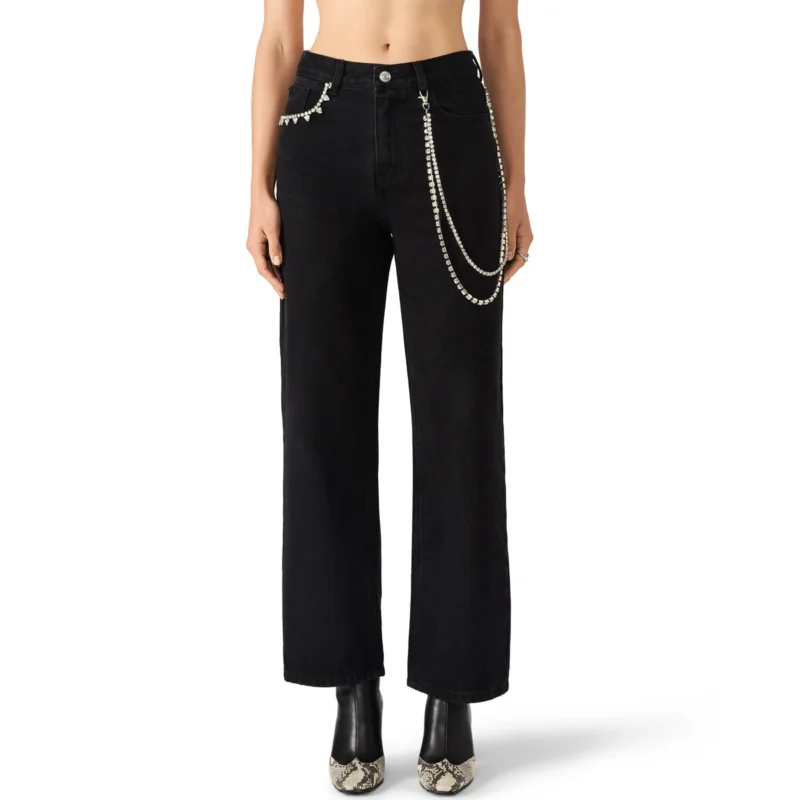 מכנסי ג'ינס בשחור לנשים עם שיבוץ אבנים בכיס ושרשרת משובצת אבנים מבית סטיב מאדן