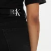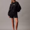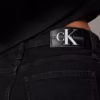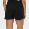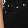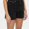 ג'ינס קצר (שורט) Mom מבית Calvin Klein בגובה מותן גבוה, עשוי דנים קשיח בצבע שחור עם שוליים קרועים למראה עדכני ואופנתי.
