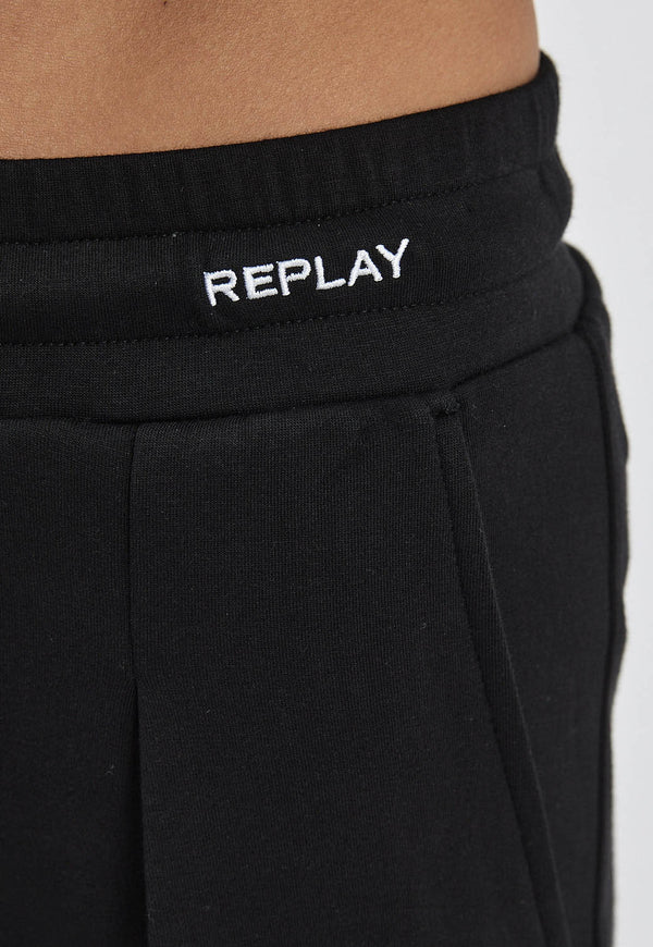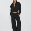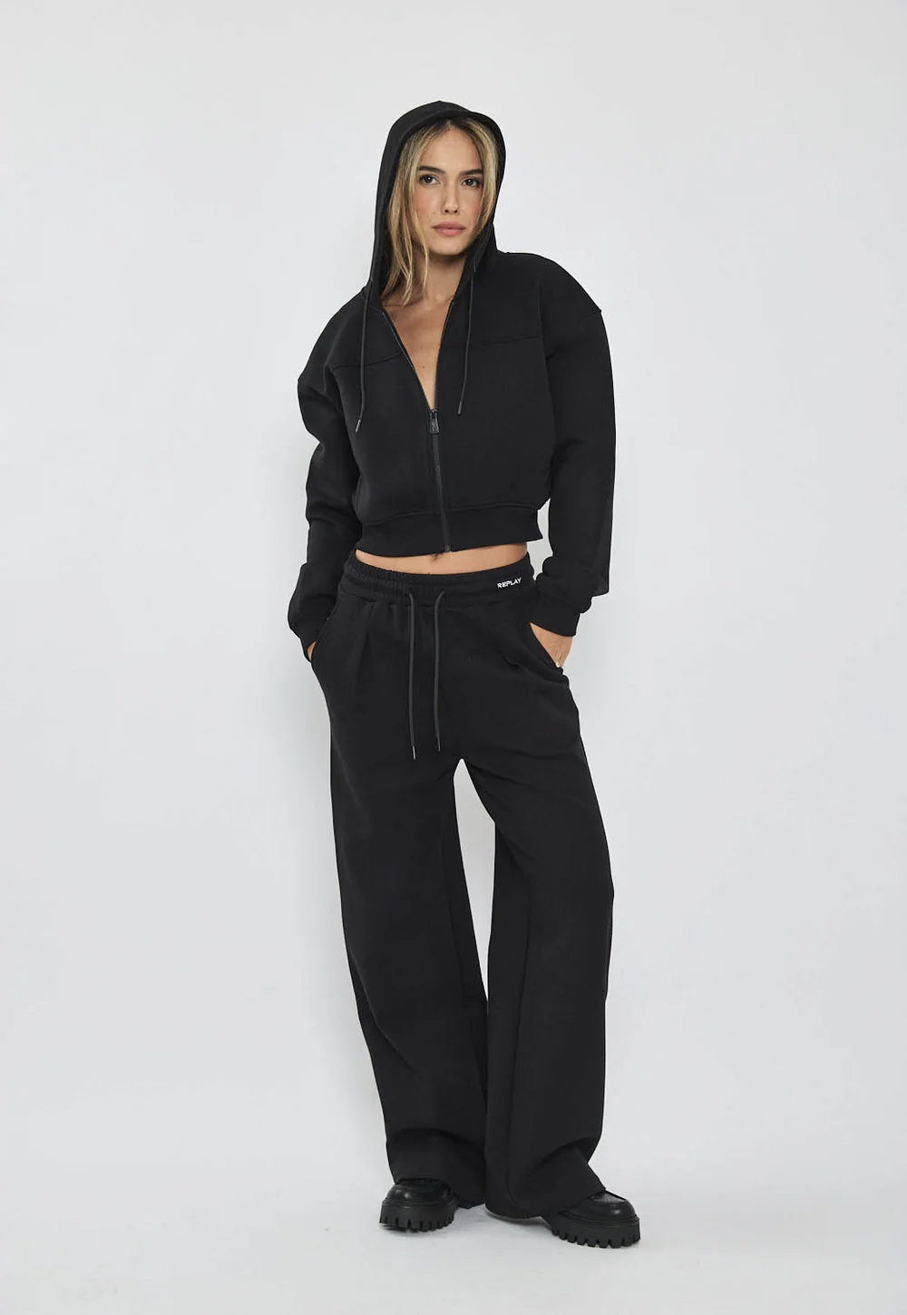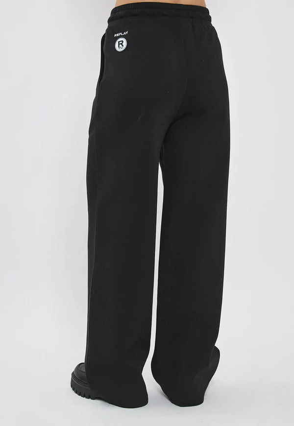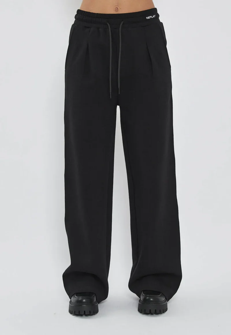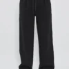 מכנסי טרנינג לנשים מבד אינטרלוק נעים, בגזרה רחבה ונינוחה עם מותן אלסטית ושרוך התאמה. כיסים צדדיים ונפילה ישרה שמחמיאה ומעניקה מראה מודרני. שחור קלאסי שמתחבר מצוין לקפוצ׳ון תואם או טי-שירט ללוק יומיומי נוח ומעודכן.