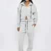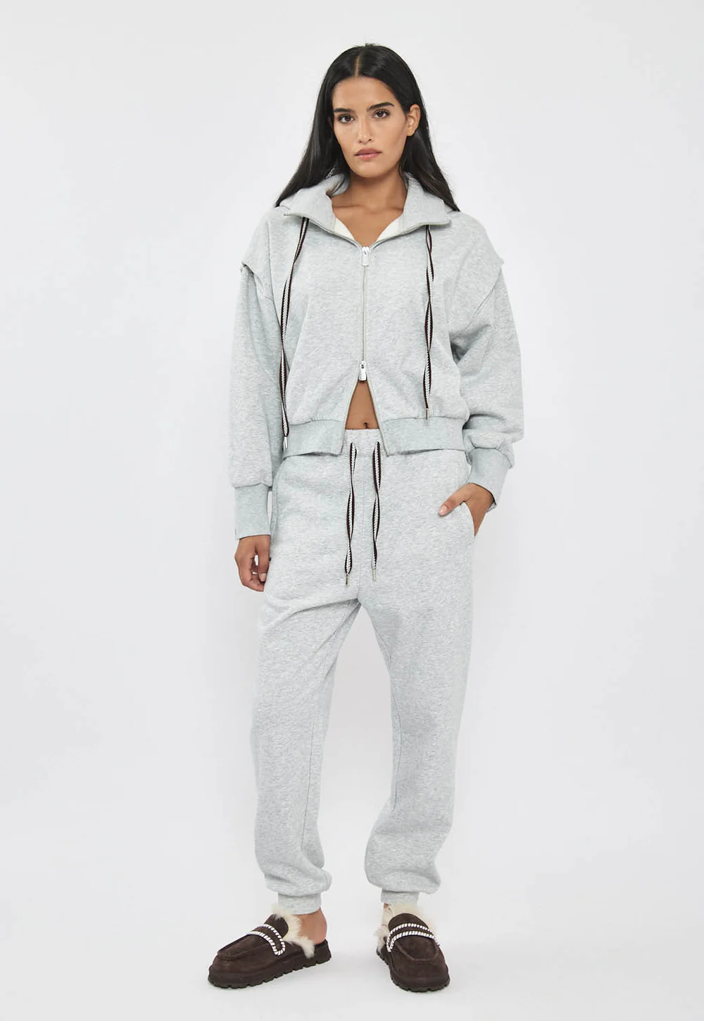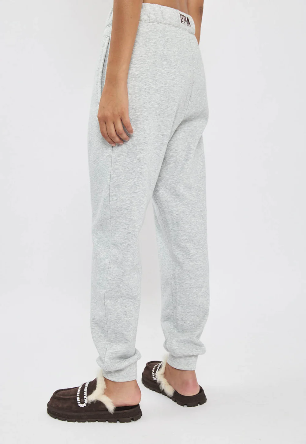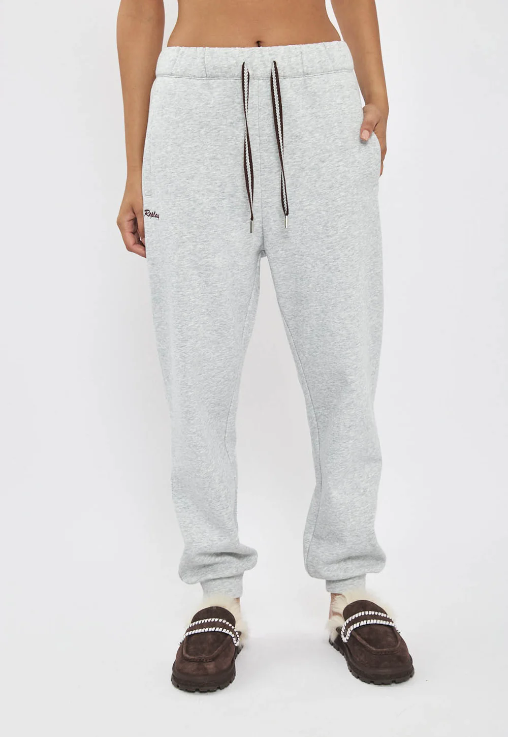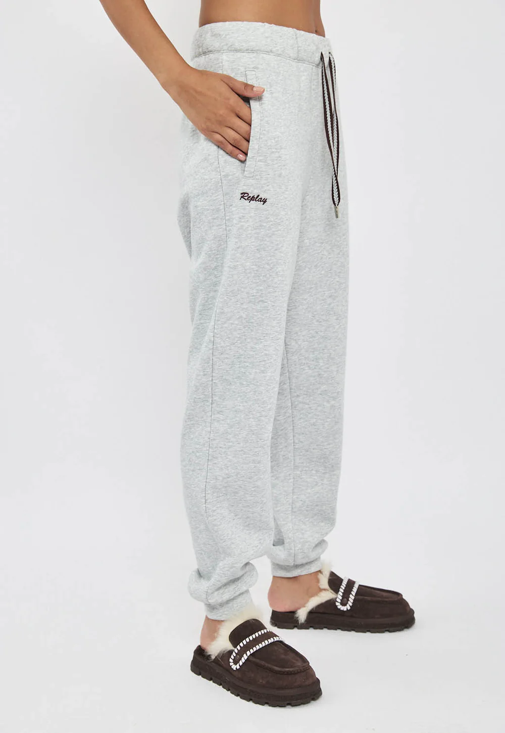 מכנסי טרנינג לנשים מבד CVC נעים ורך (תערובת כותנה ופוליאסטר) בגזרה נוחה ליומיום. גומי במותן עם שרוך מתכוונן, כיסים צדדיים וסיומי ריב סביב הקרסול לנוחות והתאמה מושלמת. צבע אפור מלנג’ קלאסי עם לוגו קטן עדין בצד. מתאים לבית, לסידורים ולמראה ספורטיבי אופנתי.