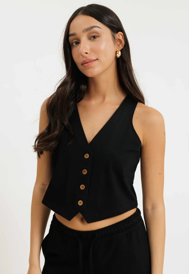 וסט אלגנטי בגזרה מחמיאה עם כפתורים בחזית, עשוי מבד אינטרלוק נעים ואיכותי. מושלם לשילוב עם מכנסיים תואמים ללוק מוקפד, או עם ג'ינס לשיק יומיומי. תוספת מדויקת לכל מלתחה!