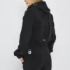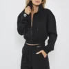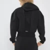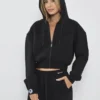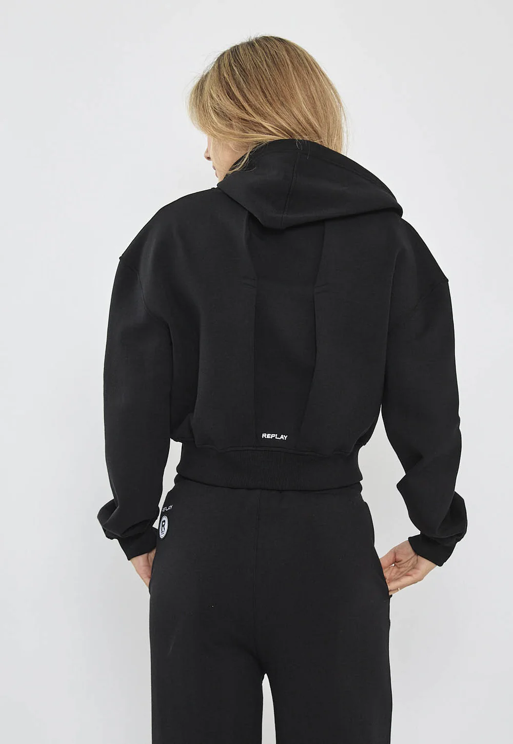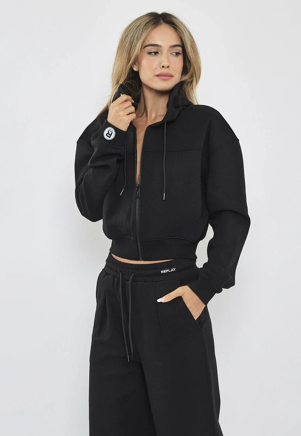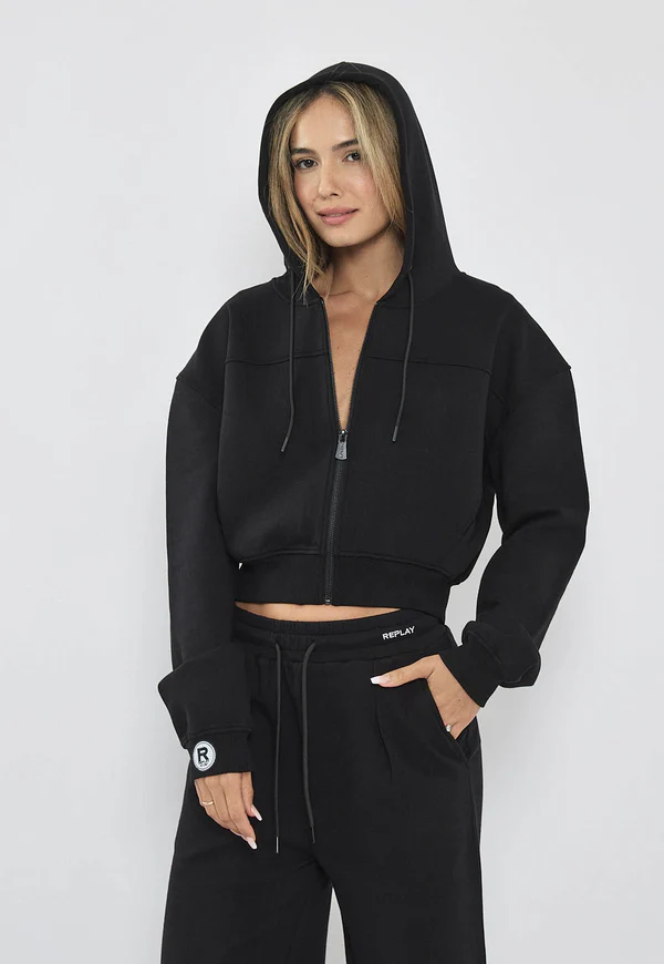 קפוצ׳ון לנשים מבד אינטרלוק נעים בגזרת קרופ מחמיאה. סגירת רוכסן מלאה, כובע עם שרוכים, כיסים צדדיים וסיומות ריב מודגשות במותן ובשרוולים להתאמה יציבה. פאץ׳ לוגו עגול על השרוול מוסיף טאץ׳ ממותג. שחור קלאסי שנראה מצוין עם מכנסי טרנינג תואמים או ג׳ינס ללוק יומיומי נקי ומעודכן.