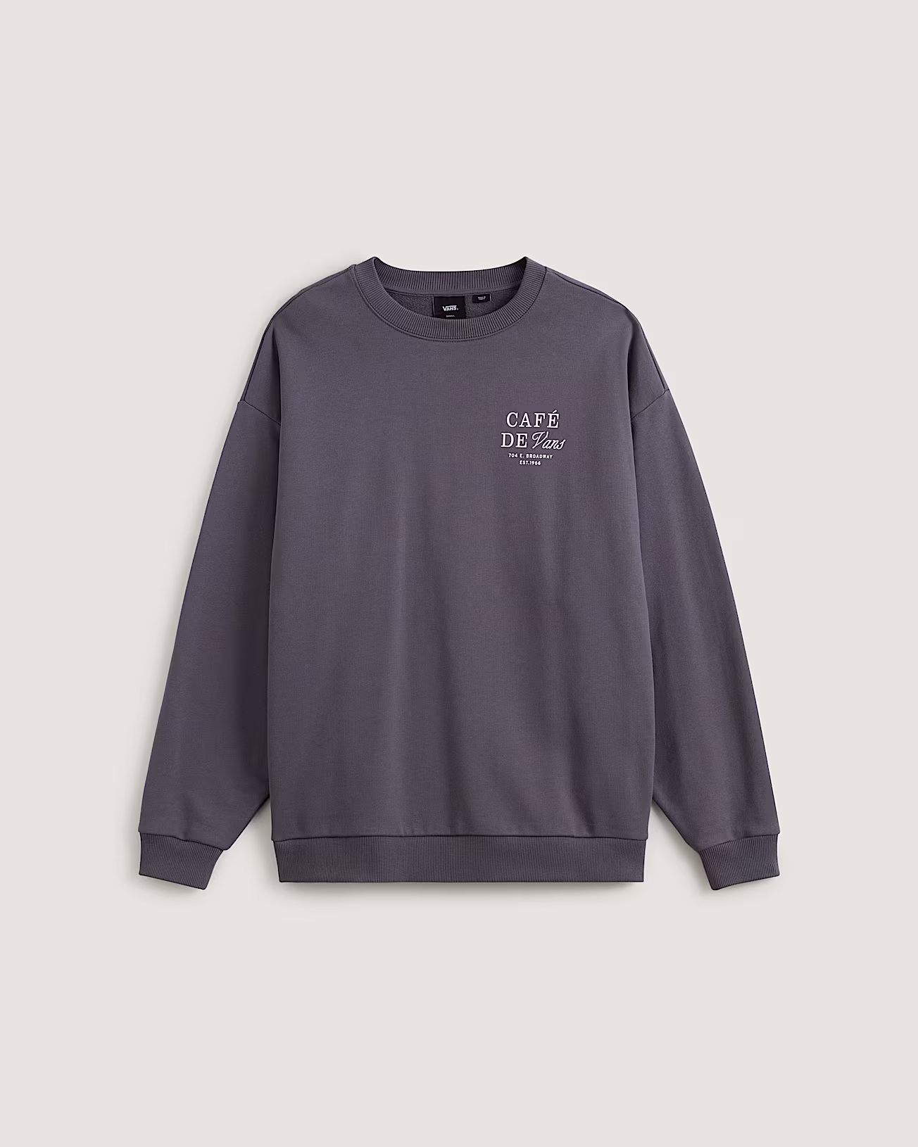 סווטשירט אוברסייז של וואנס בעיצוב בהשראת קפה צרפתי, עם כיתוב על החזה והדפס גדול בגב. עשוי מבד נעים ונוח בגזרה רחבה ומשוחררת למראה רך ואופנתי.