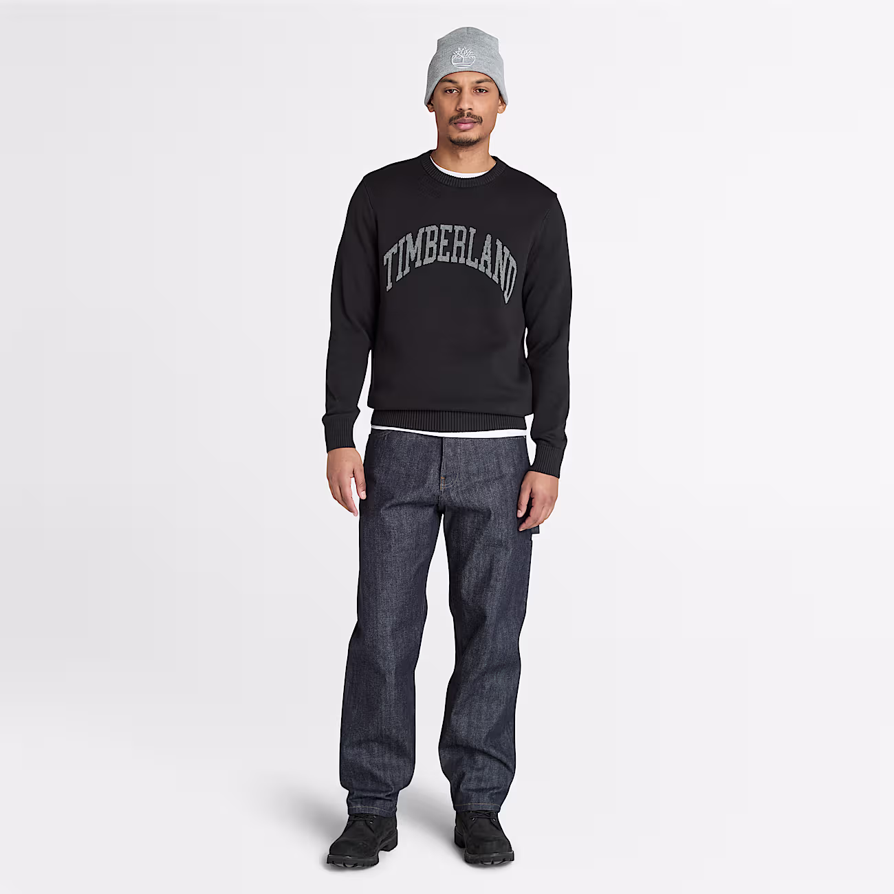 סוודר לגברים בגזרה רגילה מבד סריג כותנה אורגנית שחורה טהורה, עם לוגו של Timberland בחזית.