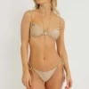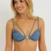 סט ביקיני בגימור דמוי ג'ינס הכולל חזייה עם קשירה כפולה ולולאה מוזהבת מרכזית, ותחתון קשירה בגזרה קלאסית עם טבעות זהובות בצדדים. מעניק מראה ייחודי, נועז ואופנתי – הבחירה המושלמת לים ולבריכה בקיץ הקרוב.