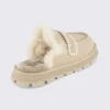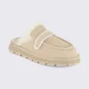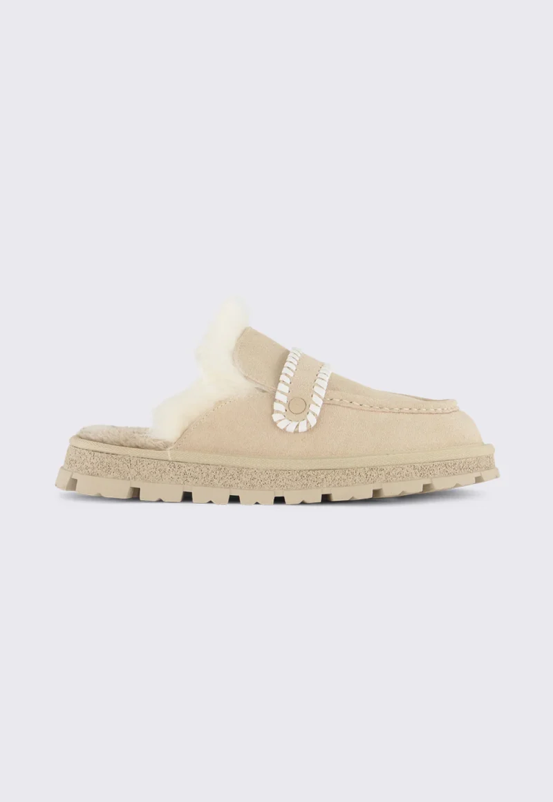 כפכפי Mule פתוחים מאחור לנשים בגוון בז׳, עם גפת מראה זמש רכה וריפוד פנימי מפרווה סינתטית חמימה. רצועה דקורטיבית עם תפרי “וידה” ולחצן מתכתי בחזית, וסוליית טרק עמידה לנוחות ואחיזה מצוינת בבית ומחוץ לו. מושלמות לימים קרירים בעונות המעבר והחורף, משלבות מראה מוקפד עם תחושת נוחות מפנקת.